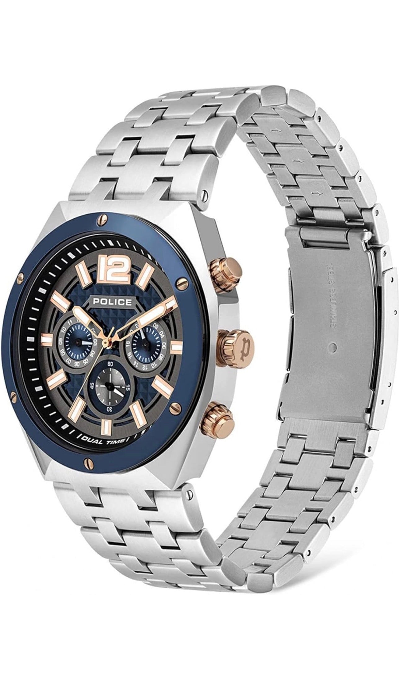 The Police PL15995JSTBL61M men's watch is a refined choice in the segment of men's watches, combining strength and contemporary style thanks to its full stainless steel construction, both in the case and the bracelet. This material not only provides an elegant and modern look but also ensures remarkable durability and resistance to daily wear. The watch features a stainless steel bracelet with a folding clasp, making it easy to adjust securely and comfortably to the wrist, suitable for both formal and casual occasions. The design includes a mineral crystal, known for its scratch resistance and protection against minor impacts, enhancing the watch's longevity compared to more conventional glass options. It also offers 5 ATM water resistance, meaning it can withstand splashes, rain, and even showers, though it is not recommended for prolonged immersion or demanding water sports. Manufactured in China under strict quality controls, this model meets current functional and aesthetic standards in men's watchmaking. The PL15995JSTBL61M reflects Police's commitment to offering robust and modern watches, making it a balanced option for those seeking both practicality and elegance in a single accessory.